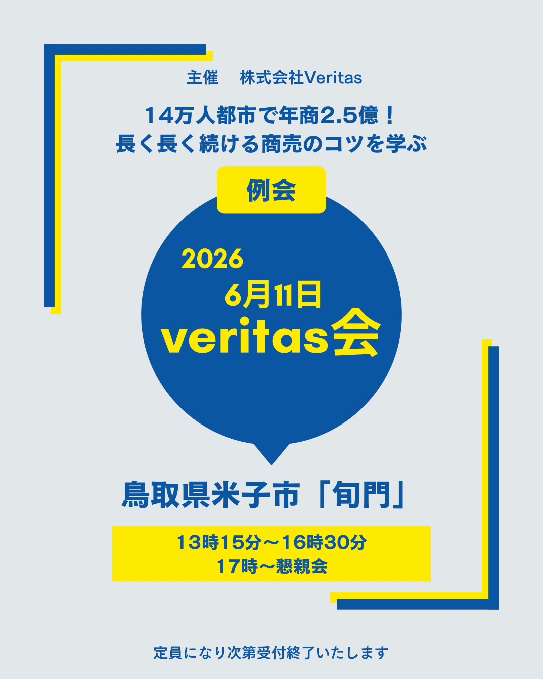 2026年6月11日(木) ベリタス会 in米子を開催します 米子市は人口14万で68810世帯 山陰地方に位置する場所 そこにあるのが「旬門」 前職時…